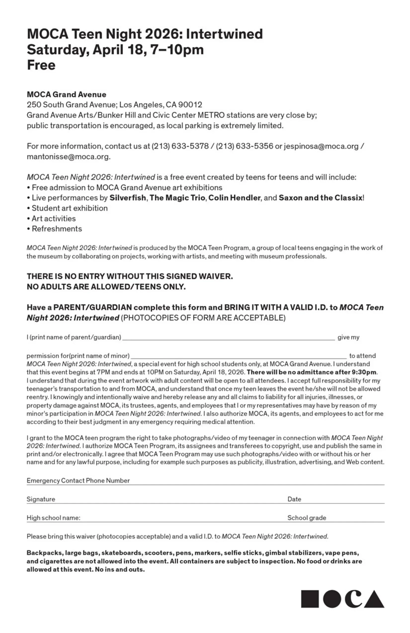 You must have a PARENT/GUARDIAN complete this form and BRING A PHYSICAL COPY WITH A VALID I.D. to get into MOCA Teen Night!