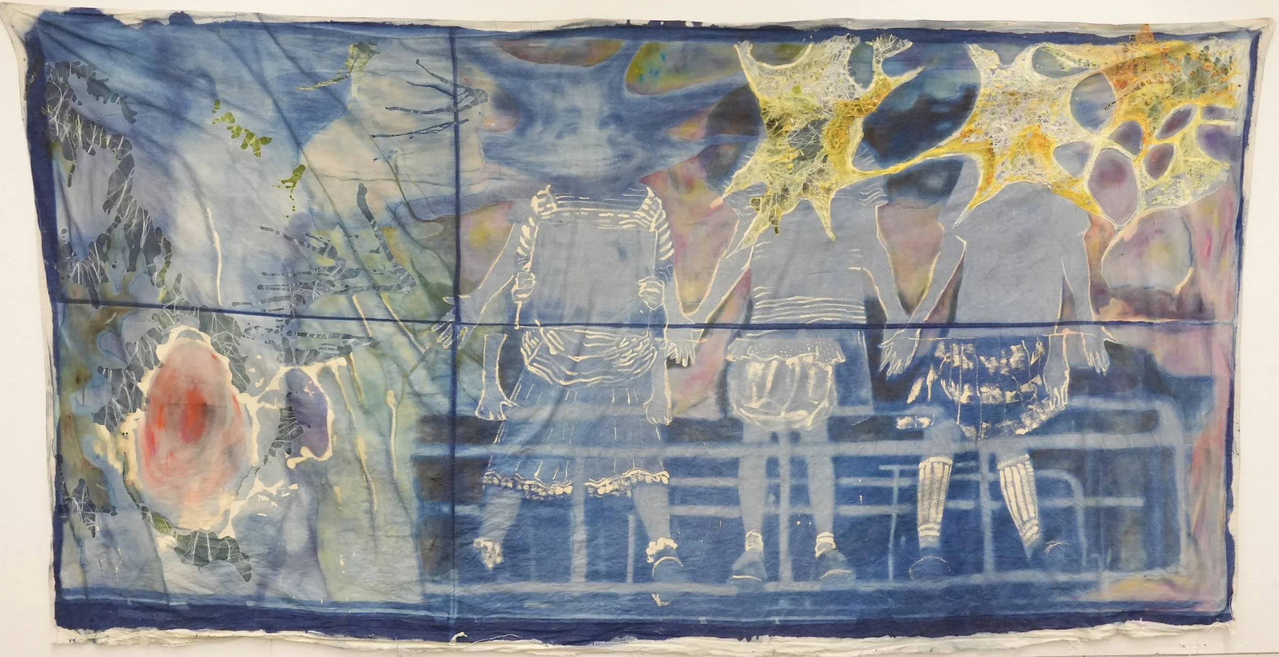 Cyanotype, washing soda, paraffin wax, candle dye, acrylic paint on canvas dropcloth
