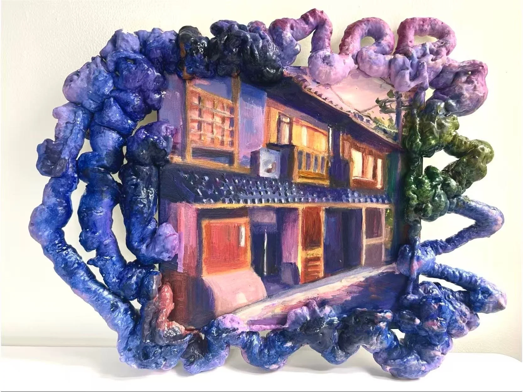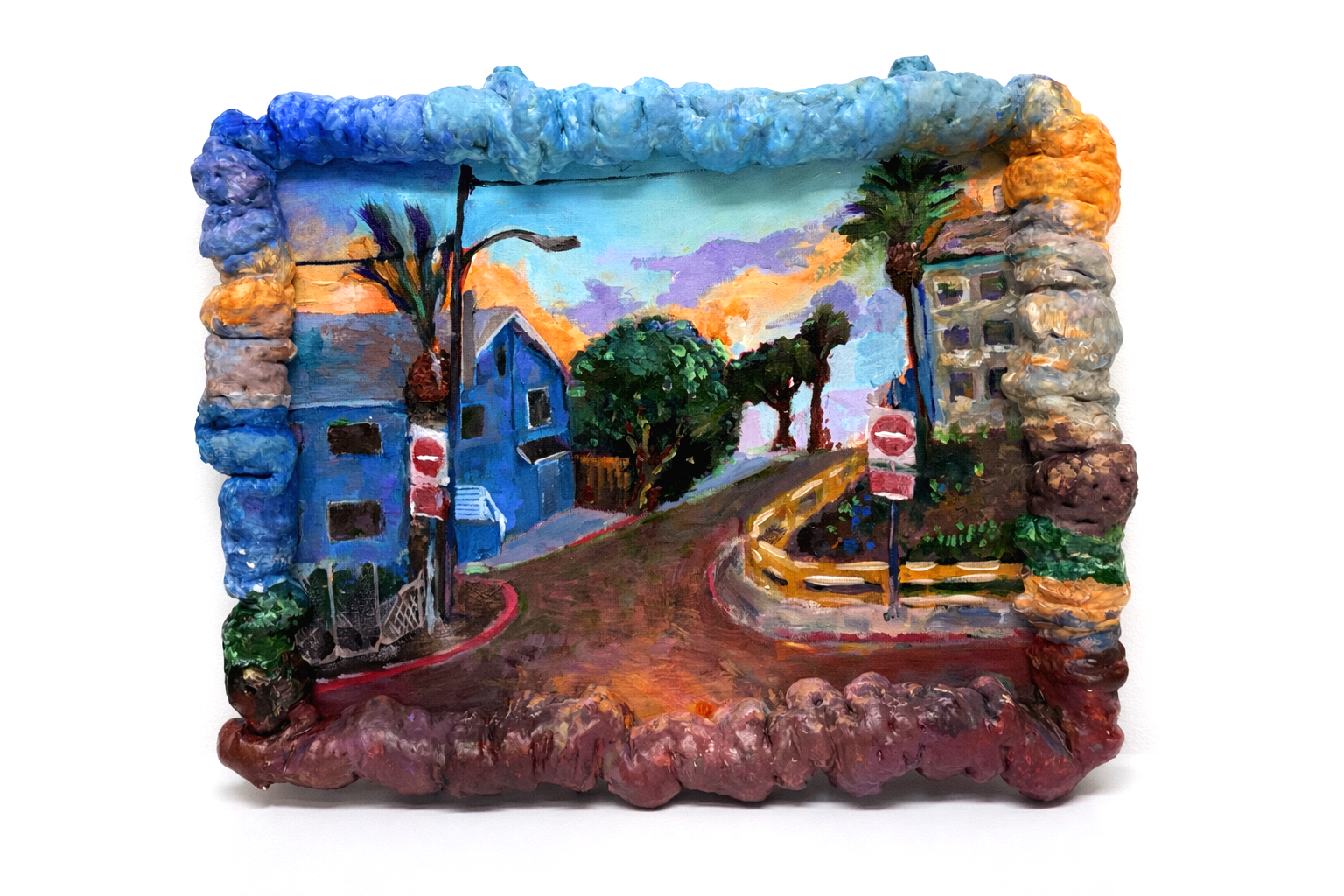 In the lingering afterglow of the sunset, the street becomes tender and nostalgic. Peach and rose tones soften the sky while indigo shadows stretch across the pavement. The windows glow with soft light of the setting sun, and time slows. The textured frame curls around the scene and extends the piece, giving it both structure and whimsy. It reflects the day’s end, its memories, and the fleeting warmth of dusk.